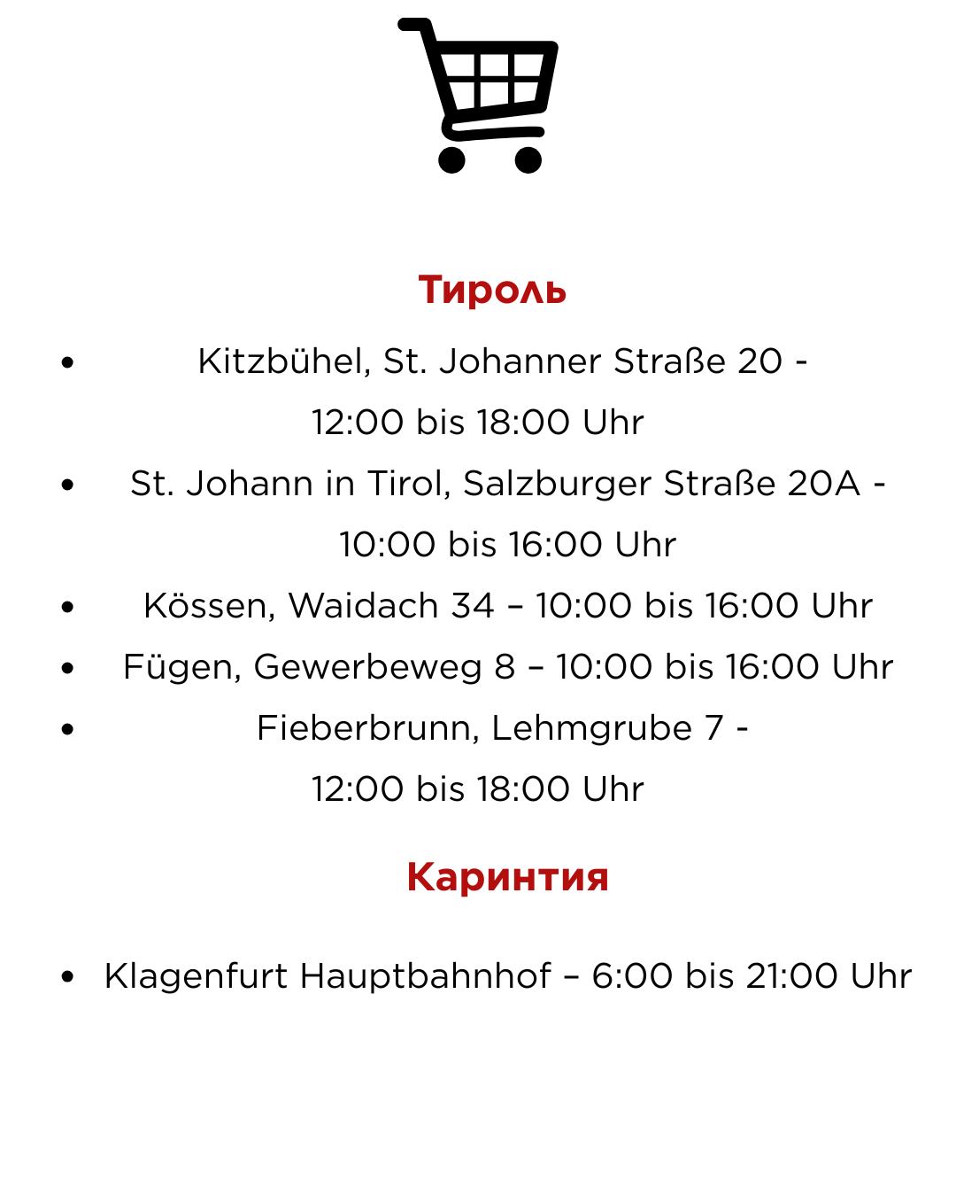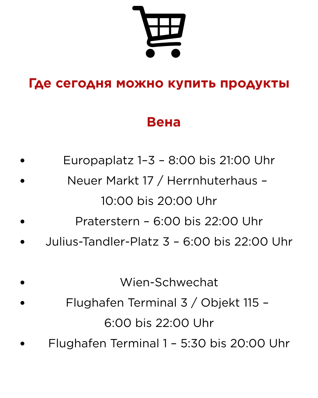 Компания SPAR сообщает, что отдельные магазины на железнодорожных вокзалах – например, в Вене, Линце или Граце – а также на горнолыжных курортах Форарльберга, Тироля, Зальцбурга и Каринтии открыты.