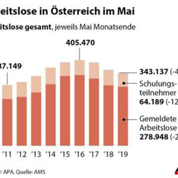 Уровень безработицы в Вене снизился и в мае. По подсчётам за прошлый месяц, в Австрии сейчас 343.137 безработных. 64.000 из них уже проходят обучение.