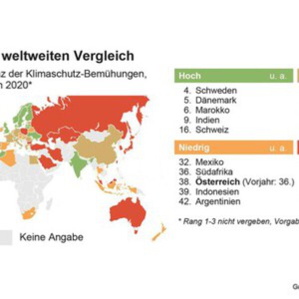 В рейтинге, представленном на конференции ООН по изменению климата в Мадриде, ни одно государство не является достаточно образцовым с точки зрения защиты климата. Австрия опустилась на 38-е место по сравнению с прошлым годом (36-е место) из-за плохих результатов климатической политики. Эксперт Гринпис Адам Павлофф находит это «постыдным».