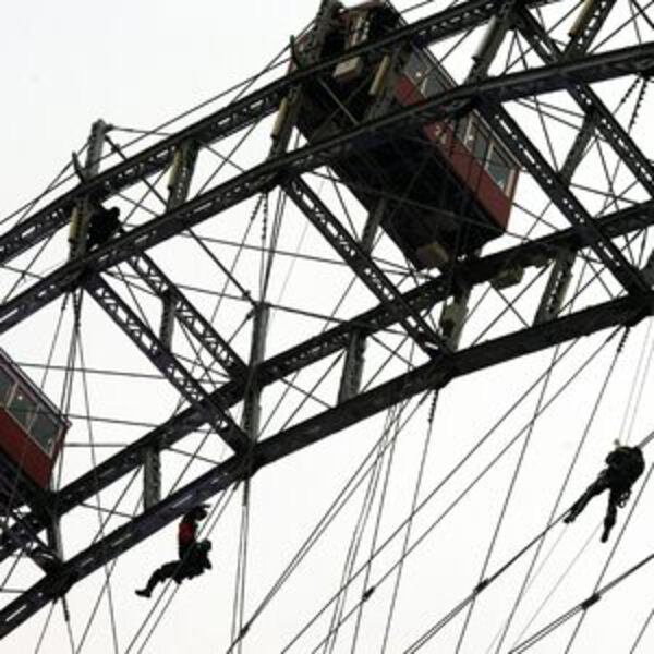 Сегодня на учения к колесу обозрения в Пратере приехали полицейские, спасатели и пожарные. Пока спасатели и отряд «Вега» карабкались на аттракцион с помощью верёвок, пожарные поднимались по лестнице.