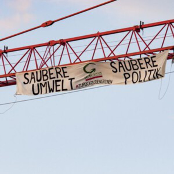 Ко дню выборов в Евросоюз зелёные решили привлечь внимание общественности особой акцией. Активисты повесили транспарант с надписью «Чистая окружающая среда – чистая политика – назад к Зелёным» на подъёмный кран над парламентом.