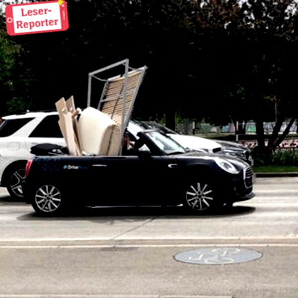 Водитель этого мини-кабриолета сумел упаковать в маленькую машину целую кровать, включая решетчатую раму и матрас.